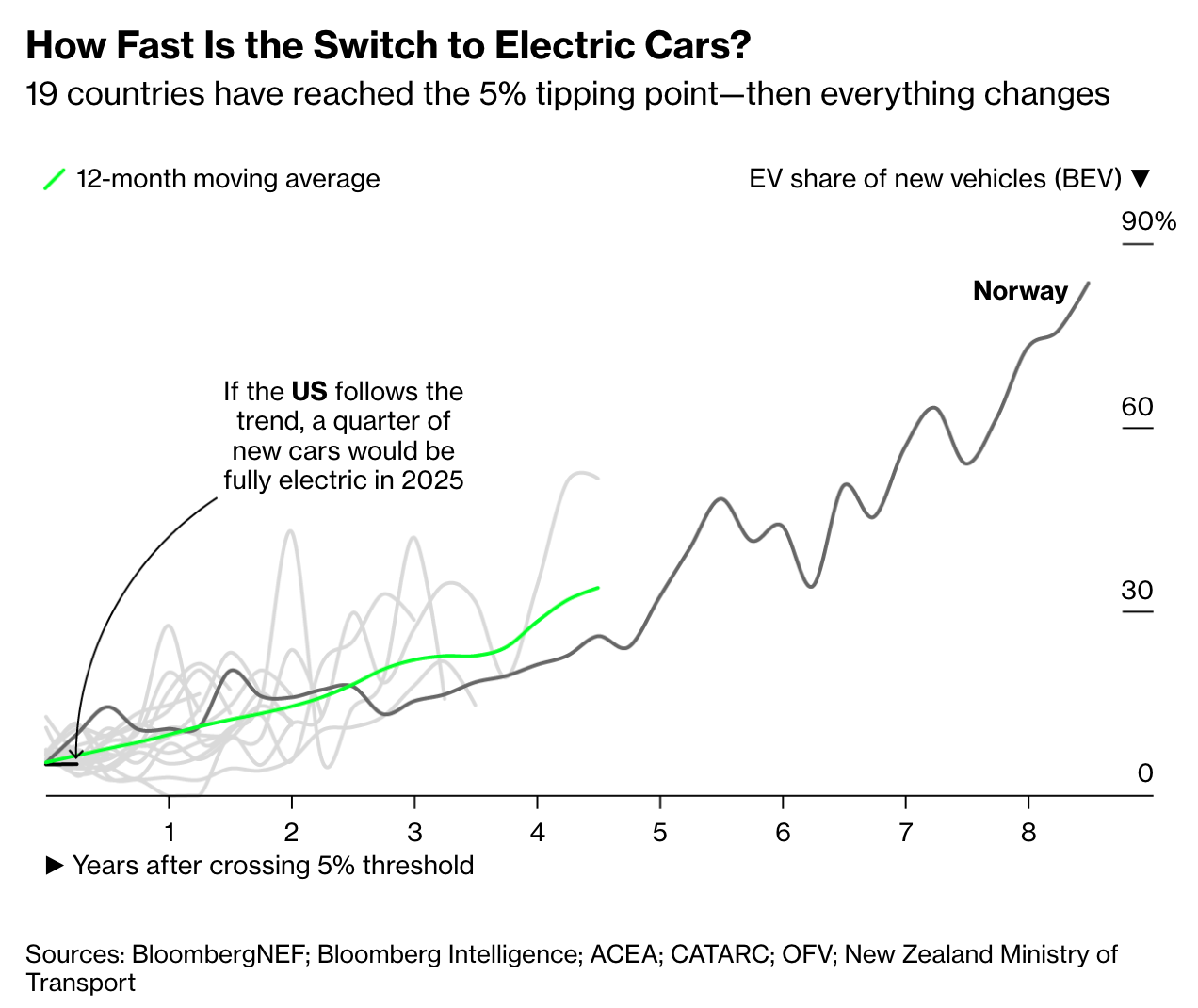 The USA just crossed the “tipping point” for electric car adoption… According to Bloomberg, once a country passes a point where 5% of all new cars are fully electric, adoption expands from there. Check out this chart of predicted growth for the USA 👇👇👇
