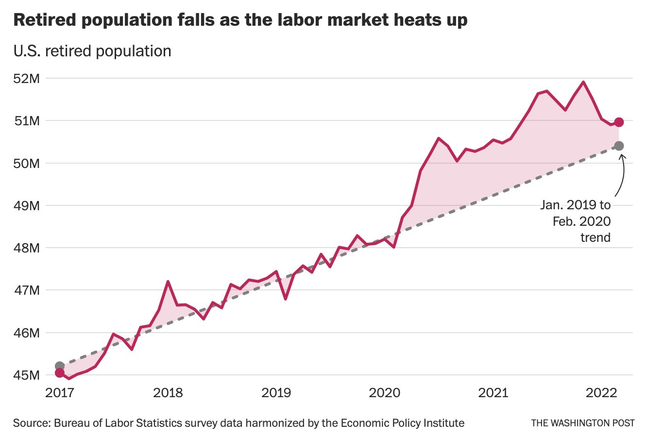 But that trend seems to be reversing now, with ~1.5 million retirees going back to into the workforce.