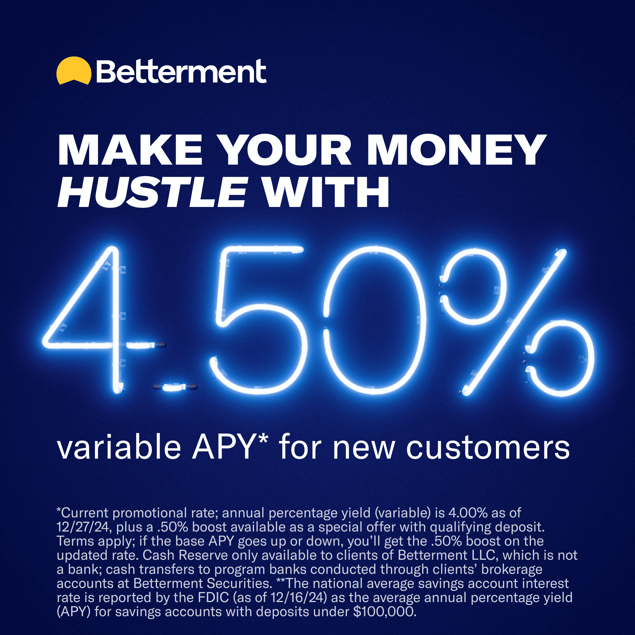 Turn out the lights on traditional savings accounts. With Bettermentâs high-yield cash account, your money is earning nearly 11x the national average**. Get started.