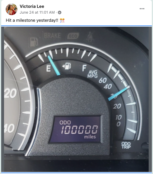 Woot woot! Congrats to Victoria who crossed 100k miles in her 2014 Toyota Camry!