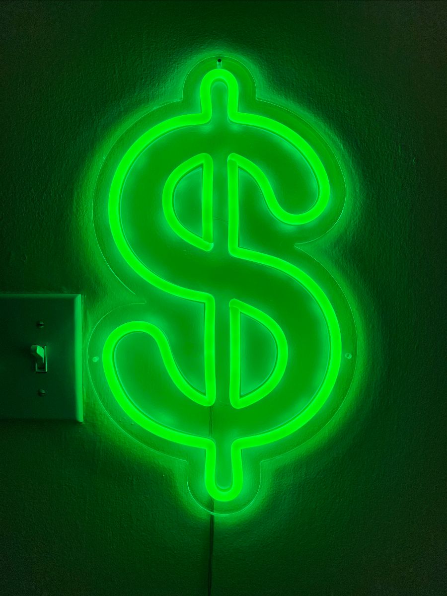 2) Create a “hook” to finish and shut down work. We learned this from Cal Newport — His hook is saying “schedule shutdown complete.” He literally says it out loud. That’s more of a computer-nerd way of doing it… But we actually have a glowing neon dollar sign that automatically turns off at 4:30pm which is a Pavlovian reminder for us to shut everything down. It helps us mentally unplug from work. (and a nice bike ride home afterwards creates a delightful buffer between work and going full-on into our family evening routing). Here’s a pic of our sign 👇