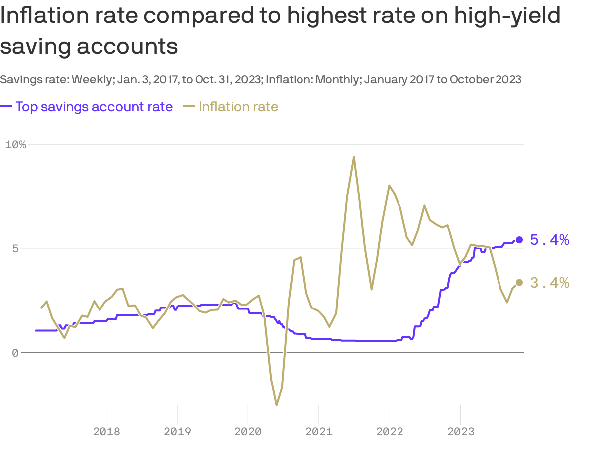 Today’s chart is from Axios, showing the US inflation rate compared to the highest-paying HYSA accounts over the last 7 years.