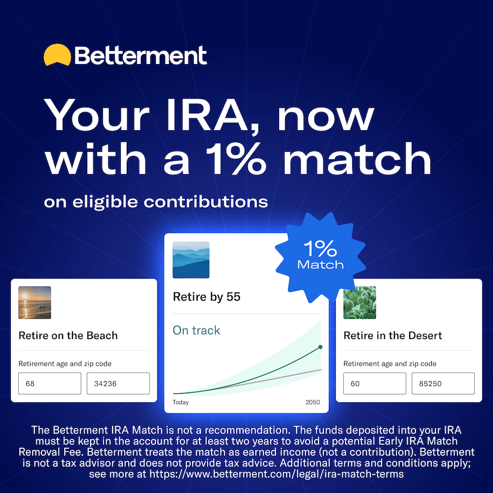 Betterment wants to help fund your future! Invest in a Betterment Roth or traditional IRA, and they’ll match 1% of your eligible contributions at the end of this year. Terms Apply. Get started today.