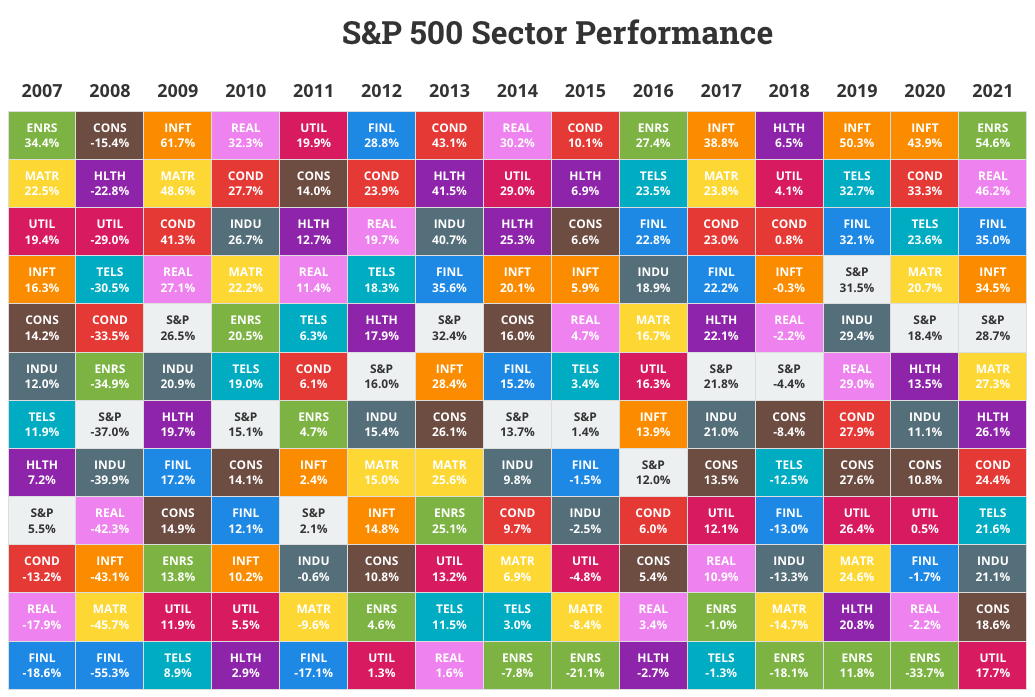 For example, in 2021 we can see the Energy, Real Estate and Financial sectors (green, pink, blue squares) had the best performance. But the year prior in 2020, they all had the worst performance. Each year brings drastically different results per sector.