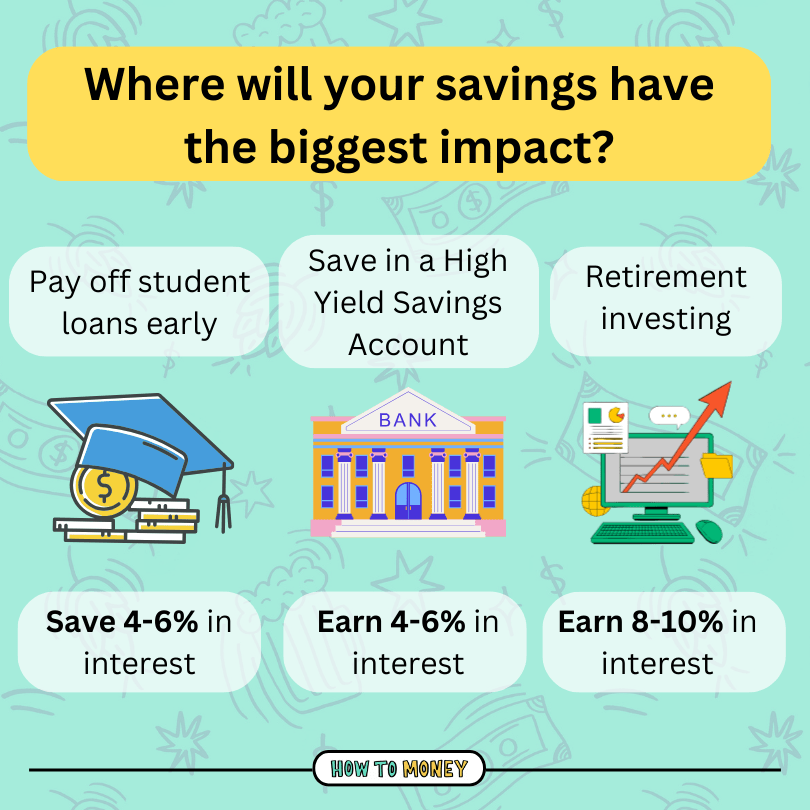 If your student loan has a lower interest rate, below 6 or 7%, you may not need to rush to pay it off early. For example, if your interest rate is in the 4% range, you could put your money into a high yield savings account and earn the same amount of interest, if not more!