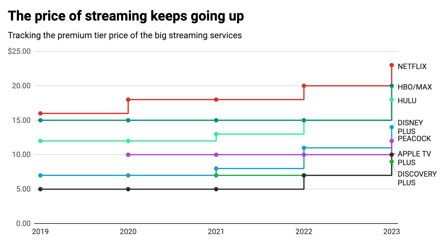 It shows the increasing costs of popular streaming services over the past few years (premium tier plan prices) 👇👇👇