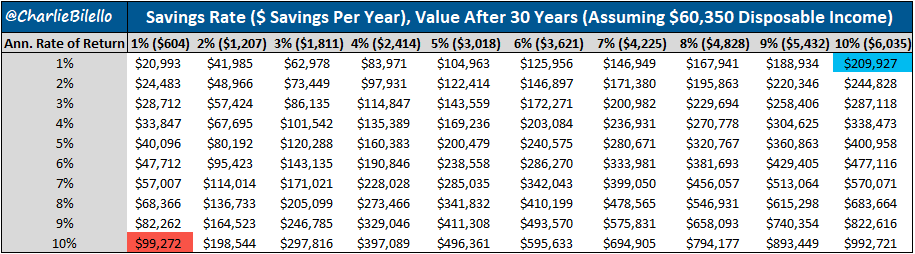 (this assumes an investor is starting with $0, and saving on a set schedule for 30 years)