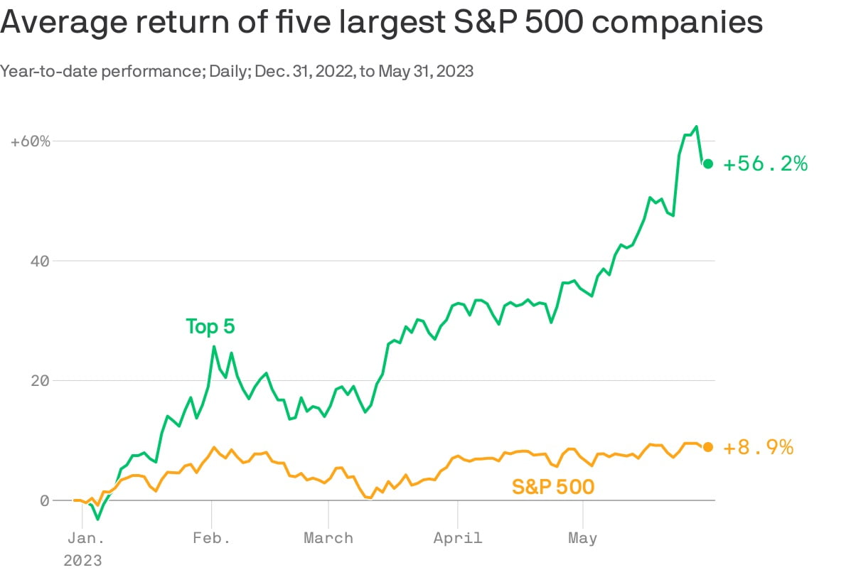 The green line:Ā This is just the top 5 stocks inside the S&P500. Those 5 stocks are Apple, Microsoft, Google, Amazon, and Nvidia. Theyāre up an average of 56% this year.