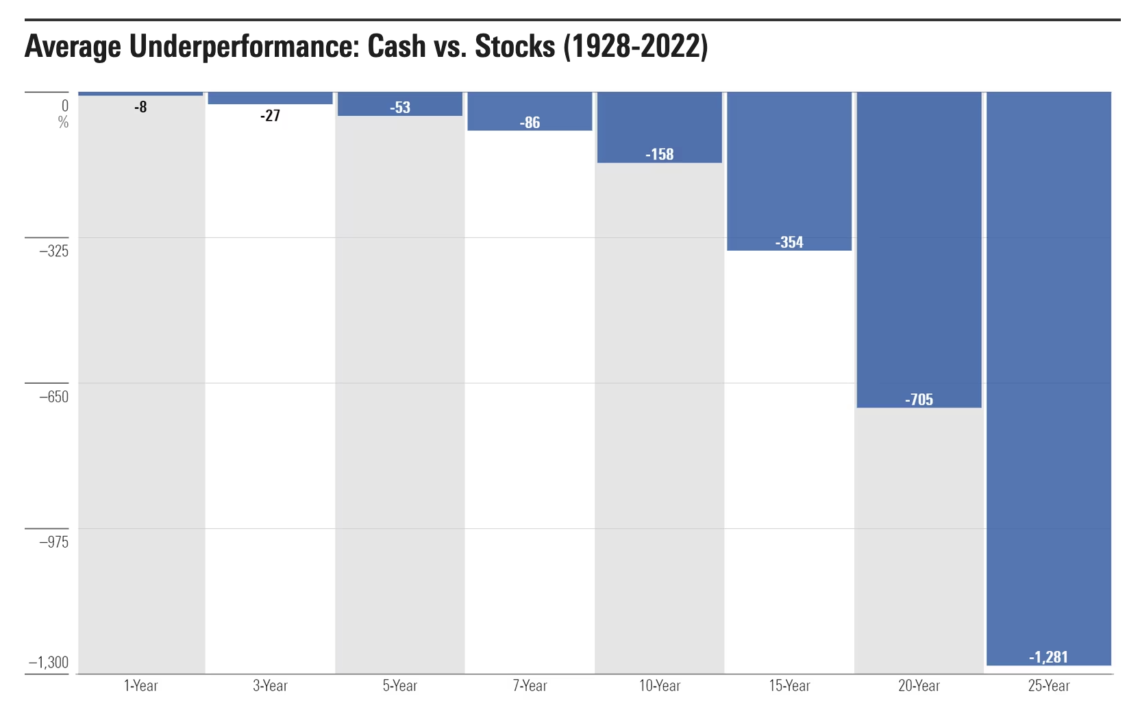 Check out this chart from Morningstar, which shows the average *underperformance* of holding cash vs investing in equities using data from the last 100 years 👇👇👇